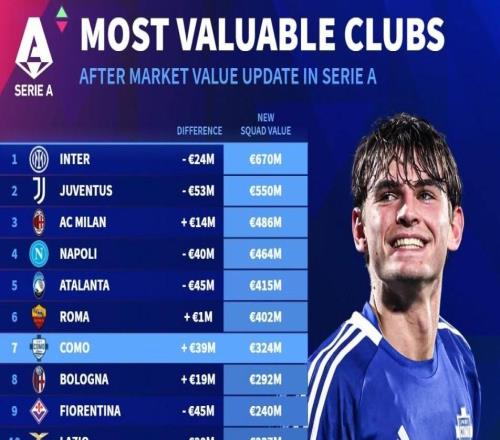北京时间12月23日,在更新了意甲球员的身价之后,德转列出了意甲俱乐部的总身价排名,此次更新后国际米兰全队的身价下跌了2400万欧元,不过他们依然以6.7亿欧元的高居第一,尤文图斯5